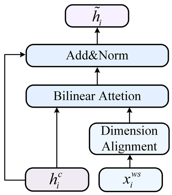 where is the weight parameter of the bilinear attention module. Using the attention score obtained from Equation (3) to weight and sum multiple potential word embedding vectors , we can obtain the fused features of all potential words corresponding to :