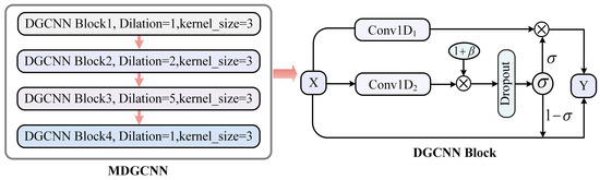 The MDGCNN is built by stacking DGCNN blocks with dilation rates of 1, 2, 5, and 1. Each DGCNN block includes a gating mechanism, consisting of two Conv1D layers with identical window sizes and dilation rates, but with independent weights. This structure enhances the model’s information flow efficiency.