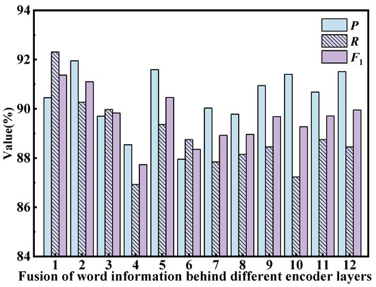 The MHA mechanism can be used to capture the semantic associations between contextual information and different entities, and different weights are assigned to different associations to improve the model recognition ability. From the experimental results in Figure 9, it can be concluded that the “-MHA” model has more parameters and the slowest convergence speed, and the model fitting ability is poorer. Both the BiLSTM and BiGRU networks are mainstream bidirectional recurrent neural network architectures used in the NLP field, characterized by robust model structures. The BiGRU model, with its reduced gating mechanism, has fewer model parameters and is easier to train, resulting in the “-BiGRU” model converging faster compared to the other three models. The “-BiLSTM” and “-BiGRU” models exhibit smaller fluctuations in their curves but are limited by the inherent structure of recurrent networks, which cannot dynamically learn context, thus capping their peak performance. Compared to the other three models, the model proposed in this paper has a distinct advantage in all three evaluation metrics, demonstrating a higher fitting ability and stronger learning capacity.
