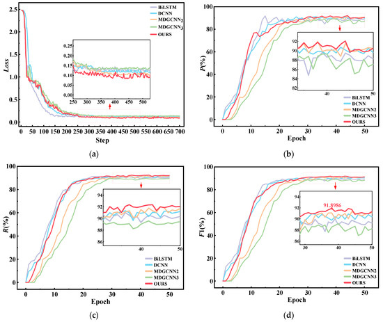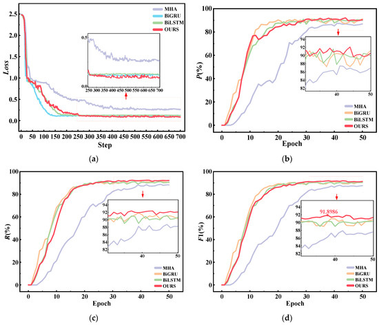 Comparison experiment of hidden feature extraction layer. (a) Loss function variation curves for each model; (b) Precision curves of evaluation metrics for each model; (c) Recall curves of evaluation metrics for each model; (d) F1 curves of evaluation metrics for each model.