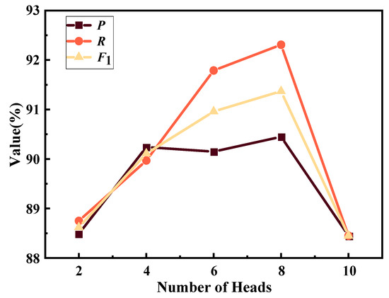 To verify the influence of the MSR_heads parameter in the MSR of the downstream model on the overall performance of the model in this paper, tuning experiments were conducted with MSR_heads set to 2, 4, 6, 8, and 10. The experimental results are depicted in Figure 10.