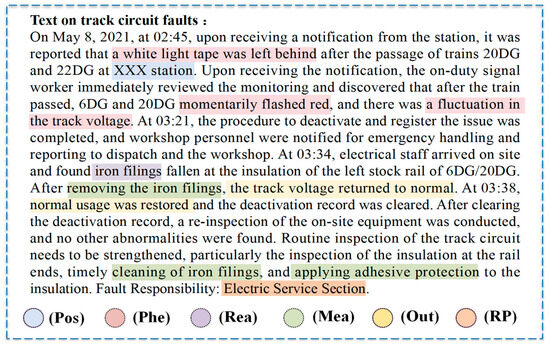 The experimental data used in this study consist of failure logs from both section track circuits and station track circuits, collected over the past five years within the jurisdiction of multiple railway bureaus. After summarizing and analyzing the textual features of these track circuit failure logs, six types of entities were identified, as shown in Table 3. The entities and their corresponding labels are as follows: “Fault Position” labeled “Pos”, “Fault Phenomenon” labeled “Phe”, “Fault Reason” labeled “Rea”, “Maintenance Measure” labeled “Mea”, “Disposition Outcome” labeled “Out”, and “Responsible Party” labeled “RP”.
