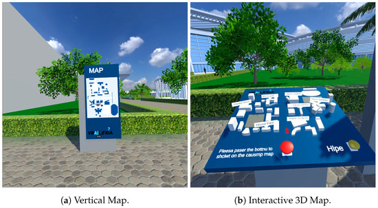 - Tutorial Stage (Start–End Stage): The experience begins with a tutorial stage located at the campus entrance. The primary objective of this stage is to familiarize users with the controls and basic navigation mechanics of the virtual environment. Informative signs provide guidance on operating the controllers and selecting between different locomotion options to navigate to the first 3D interactive map. Upon reaching the map, users receive instructions on interacting with elements such as virtual buttons. Successfully pressing the button transitions the experience into the next phase, marking the formal commencement of the user’s task-based journey.
