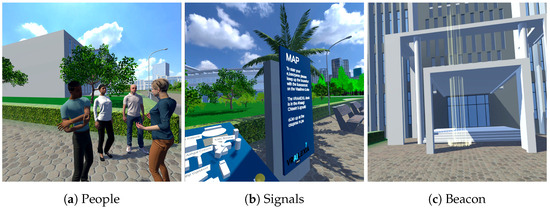 Figure 2. Different elements included in the virtual campus. - Signals: Informative signage is strategically placed throughout the campus to guide participants in completing challenges and navigating to key locations (see Figure 2b). Initially, these signs provide clear instructions (tutorial); however, as the experience progresses, some signs become increasingly difficult to read, simulating the textual decoding challenges often experienced by individuals with dyslexia. In addition to directional signs, another set of signs identifies the entrances to campus buildings, displaying their respective names to assist with orientation. Some signs are dynamically modified based on the user’s behavior. For example, the signs at the building entrances will indicate, when a participant attempts to enter the wrong building for the current task, that they are not in the correct building. This dynamic feature helps guide the user and reinforces the navigation challenges inherent to the experience. This dual purpose, navigation and simulation, underscores the barriers associated with reading and spatial awareness.