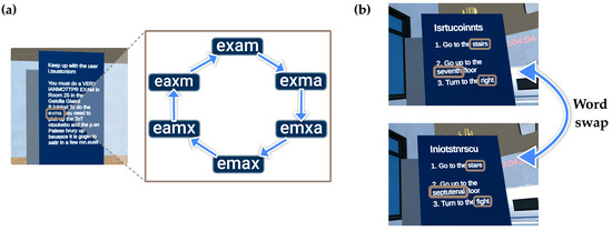 - Letter movement: This barrier involves dynamically and randomly rearranging the letters, except for the first letter of the word, within individual words, as illustrated in Figure 4a. In this example, the letters of the word “exam” change their order, forming nonexistent words like “exma”. This effect is applied to the full text of informative signs that describe tasks on the campus and also in the names of the buildings that are reflected in the maps, making the text harder to read and increasing the time needed for comprehension.