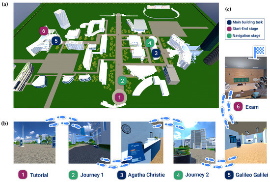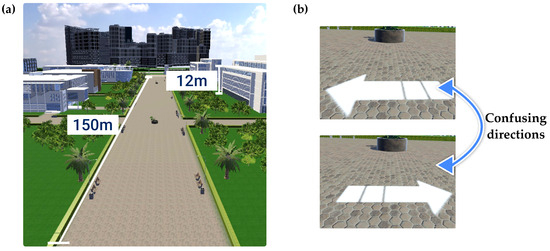 Another significant challenge faced by university students with dyslexia is orientation within large environments [37]. These environments are often vast, with similar-looking buildings and limited signage to guide navigation between locations. To replicate this challenge, the virtual campus was designed as a large-scale map featuring similar paths and structures. The scaled dimensions of the buildings and streets within the modeled campus are depicted in Figure 5a. Furthermore, the 3D maps represent the shapes of buildings in a manner that does not fully correspond to their actual structures within the virtual environment. Similarly, vertical maps omit the names of the main buildings, further complicating navigation. This design compels users to rely on both types of maps to orient themselves effectively and reach their destination.