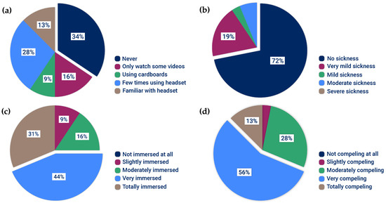 Responses to the questions measuring the quality of the VR application. (a) Have you ever tried VR before the experience? (b) Did you experience nausea, loss of balance, or discomfort during the experience? (c) How much did the visual aspects of the environment engage you? (d) How compelling was your sense of moving around and interacting within the virtual environment?