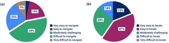 Responses to the questions measuring the effectiveness of the application in simulating barriers. (a) How challenging did you find navigating among the buildings? (b) How challenging did you find locating the classroom for the exam?