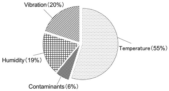As a key component linking the turbine to the grid, the reliability of the converter in a wind energy conversion system plays a significant role in the overall system performance [4,5]. The IGBT module in the wind power converter is the most critical component, being the leading cause of thermal-related failures. It not only constitutes approximately 40% of the total system cost but also accounts for over 60% of all failures within the system [1]. Among the various failure causes, temperature steady state and cyclical variations are the most prominent, as illustrated in Figure 1 [6], with temperature-induced failures representing 55% of the total failures [7]. Research has shown that fluctuations in junction temperature accelerate IGBT module aging, causing thermal stresses and material interface degradation. These factors eventually lead to failures in the solder layer and bonding leads, potentially resulting in system shutdowns or catastrophic failures [8,9]. Moreover, it has been demonstrated that for every 10 °C increase in the junction temperature of a silicon device within its rated operating range, its lifetime is reduced by approximately 50% [10]. In wind grid-side converters, high-frequency and fundamental-frequency junction temperature fluctuations have a relatively minor impact on IGBT lifetime, while low-frequency temperature fluctuations are the primary contributing factor [11,12]. Therefore, effective thermal management of IGBTs is crucial for enhancing the overall reliability of the system.