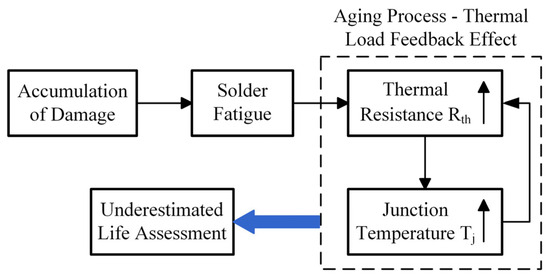 Failure analysis of power devices reveals that solder layer fatigue is one of the primary failure modes of IGBT modules, which is caused by the mismatch between the alternating thermal stresses and the thermal expansion coefficients of the materials in each layer. In IGBT devices, the solder layer is typically divided into the chip solder layer and the backplane solder layer. The commonly used solder materials include tin–lead alloy, tin–silver alloy, and nano-silver, which exhibit significant differences in their coefficients of thermal expansion compared to the materials at both ends. The chip solder layer, being closer to the chip and farther from the heat sink, experiences more concentrated thermal stress, resulting in generally lower reliability [22]. Solder layer failure primarily manifests in two forms: solder layer voids and solder layer cracks. The edges of the solder layer are regions of concentrated stress distribution, making them prone to crack formation. These cracks tend to propagate under repeated thermal cycling stress, ultimately leading to solder layer failure. Furthermore, during the production process, initial micro-voids may already exist in the solder layer. The cyclic shear strain and spatial temperature gradient induced by temperature variations cause these voids to enlarge over time, eventually leading to solder layer failure [23]. As shown in Figure 2, once damage or cracks occur in the solder layer, the thermal resistance of the IGBT module increases, with the increase becoming approximately exponential as the module ages. Based on the mathematical relationship between junction temperature and thermal resistance, it is evident that, even under the same electrical conditions, the magnitude and fluctuation of thermal loads experienced by the IGBT module will increase, thereby accelerating the progression of damage [24]. This results in a positive feedback loop in the aging process, exacerbating thermal stresses and accelerating the depletion of the module’s operational life. In the thermal management of IGBT modules, neglecting the effects of aging can lead to an underestimation of the thermal load, thereby significantly overestimating the module’s lifespan. Consequently, the actual performance in terms of junction temperature fluctuation smoothing and temperature suppression is often unable to meet the expected targets.