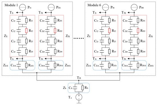 In this study, a grid-side three-phase two-level voltage-source converter connected to a permanent magnet synchronous generator (PMSG) is used as an example. The equivalent thermal network model of the converter is developed in MATLAB (R2023b), as illustrated in Figure 3. In the model, and represent the junction temperatures of the IGBT and diode, respectively; and denote the case temperatures of the IGBT and diode; corresponds to the heat sink temperature; and is the ambient temperature. Thermal impedances and represent the steady-state thermal impedances of the IGBT and diode, while and are the thermal impedances from the IGBT and diode case to the heat sink. denotes the thermal impedance of the heat sink. It is assumed that the reference temperature points for the IGBT and diode are identical. Additionally, and serve as the input excitation signals in the thermal network model [26,27].