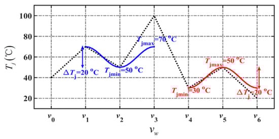 During certain phases of the thermal cycle, the magnitude of the junction temperature variation may exceed the system-specified upper limit, denoted as [32]. Figure 4 illustrates two complete thermal cycles of an IGBT in a wind power converter, each exhibiting the same junction temperature variation. However, the difference between the maximum junction temperature and the average junction temperature reaches 20 °C, which introduces additional complexity to IGBT thermal management [16]. To mitigate the risk of overheating and damage to the module, thermal management control must incorporate both and either or . Their mathematical expressions are presented in Equations (7) and (8).