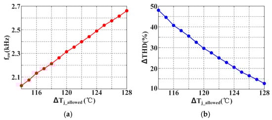 Relationship between the upper limit of the junction temperature fluctuation and the switching frequency (THD growth rate): (a) Trend of the switching frequency when the upper limit of junction temperature fluctuation grows; (b) Trend of the THD growth rate.