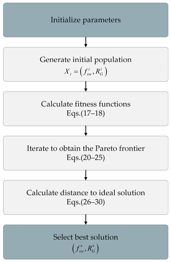 Here, represents the p-dimensional decision vector, while denotes the n-dimensional objective vector. The functions and correspond to the inequality and equality constraints of the multi-objective optimization problem, respectively. Consequently, this study reformulates the conventional thermal management challenge as a multi-objective optimization problem. A novel thermal management strategy is subsequently developed through multi-objective optimization to achieve synergistic enhancement of junction temperature suppression and output power quality.