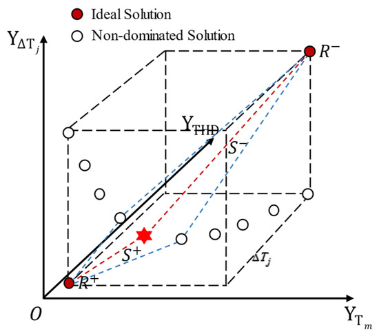 Next, the positive ideal solution and the negative ideal solution are determined according to Equations (26) and (27). The Euclidean distances and between each particle in the and and , respectively, are then calculated using Equations (28) and (29). Here, represents the distance between the non-dominated solution and the positive ideal solution, while represents the distance between the non-dominated solution and the negative ideal solution.