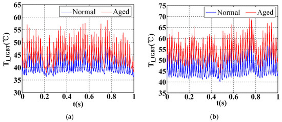 Comparison of normal and aged IGBT junction temperature waveforms after SFA and DRA modulation: (a) with SFA; (b) with DRA.