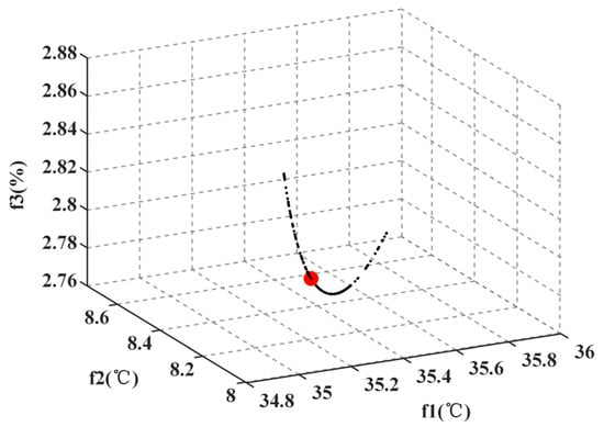 The relative proximity S of each solution is then calculated according to Equation (30) and illustrated in Figure 8 to score each solution. A larger proximity indicates that the solution is closer to the positive ideal solution, and consequently, its comprehensive score is higher [35]. Finally, the solutions are ranked in descending order based on their relative proximity, and the solution with the highest relative proximity is selected and mapped into the decision space. This corresponds to the optimal thermal management decision vector , which is depicted as the red hexagonal symbol in Figure 8.