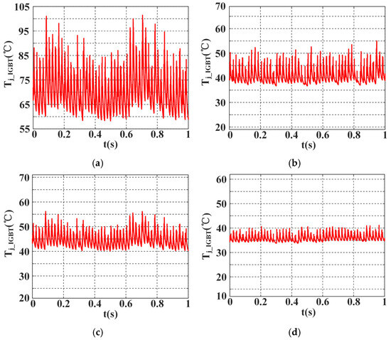 Comparison of IGBT junction temperature waveforms under different thermal management strategies: (a) with WTM; (b) with SFA; (c) with DRA; (d) with AAMO-TM.