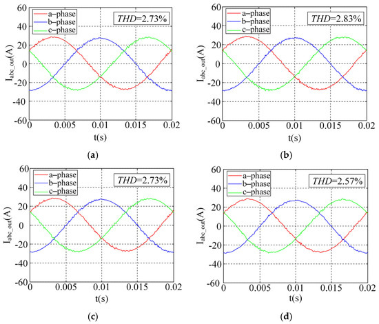 To verify the impact of the thermal management strategy proposed in this paper on the power quality of the system’s output three-phase alternating current (AC), the three-phase current waveforms corresponding to the time period after the junction temperature waveforms stabilize are extracted, as shown in Figure 12. Since the amplitudes and frequencies of the three-phase AC currents—labeled a, b, and c—are equal and differ only by a 120° phase shift, the a-phase current is selected for analysis. The total harmonic distortion (THD) of this phase current during the time period is used to characterize the power quality. As shown in Figure 12a,c, no change in THD is observed before and after drive resistance adjustment (DRA), indicating that drive control does not affect power quality. However, under the influence of the thermal management strategy proposed in this paper (Figure 12d), the THD value is reduced by 0.26% compared to the switching frequency regulation method (Figure 12b). This reduction mitigates the negative effects of thermal management on the output current and achieves compensation for the power quality.
