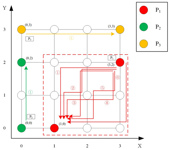 Critical information can be extracted in a 2D mesh network once a packet’s source and destination nodes are identified. Figure 1 provides an example to demonstrate the deterministic parameters further. Packet P1 needs to be transmitted from node (3,2) to node (1,0). Due to the relatively simple logic of the shortest path algorithm and its ease of implementation in hardware, only the shortest path is considered. There are six paths to choose from. No matter which path is chosen, P1 is sent in the west or south direction during the routing process and the hops along X and Y directions are also the same. Packet P2 needs to be transmitted from node (0,0) to node (0,2) and both of them belong to Column 1. Only one path is available, with zero hops in the X direction and two hops in the Y direction. P2 is routed northward at each hop. Packet P3 needs to be transmitted from node (0,3) to node (3,3) and both of them belong to Row 3. There is also only one path to choose from with three hops in the X direction and zero hops in the Y direction. P3 is routed eastward at each hop. P1, P2, and P3 represent three typical packets. The analysis indicates that once the source and destination nodes are established, it is possible to determine the directional relationship between them and the corresponding hops in that direction at the packet injection stage. The determined information is crucial for our strategy.