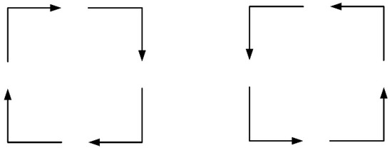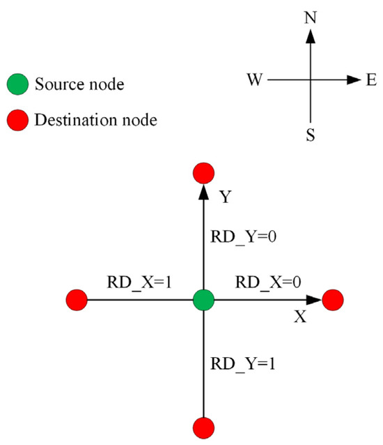 The routing direction (RD) is a binary code used to indicate the positional relationship of the source–destination nodes. The detailed coding method is illustrated in Figure 2. The east–west direction is represented by the X-axis and the north–south direction by the Y-axis. Whereas “1” indicates that the destination node is in the negative direction of the source node, “0” indicates that the destination node is in the positive direction of the source node.