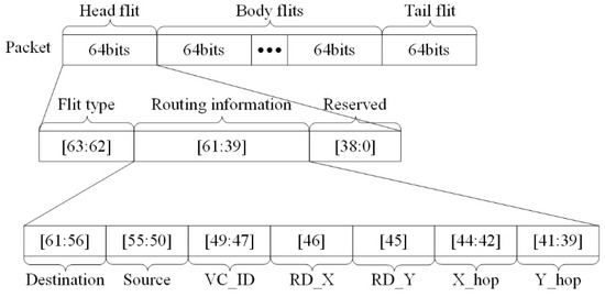 To accurately record the necessary information, it is imperative to revise the conventional packet structure. Typically, a routing packet usually consists of a tail flit, one or more body flits, and a head flit. Taking a 64-bit NoC as an example, the packet structure is illustrated in Figure 3. With 2 bits set aside for the flit type, 6 bits for the source node coordinates, 6 bits for the destination node coordinates, and 3 bits for VC choose information, it is presumed that the head flit has the 17 bits of information that are required. Consequently, there are 47 free bits reserved in the head flit. To effectively capture the determined information, we can utilize 8 of these reserved bits—allocating 2 bits for RD, 3 bits for X_hop (horizontal hop), and another 3 bits for Y_hop (vertical hop). Furthermore, the width of the parameters can be adjusted flexibly to accommodate networks of varying scales.