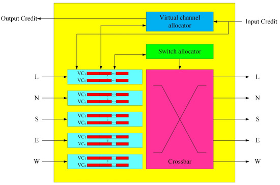 A well-designed routing algorithm must effectively prevent deadlocks. Deadlocks typically arise from circular dependencies among data packets within a network. The presence of a complete circular can result in a deadlock [13]; therefore, it is essential to break this loop. The famous turning model [14] eliminates potential resource dependency loops by prohibiting certain specific turns, ensuring deadlock-free data transmission in the network. It can improve the stability and reliability of the network to some extent and is easy to implement and maintain. However, when there are changes in the network topology, it may be necessary to readjust or optimize the turning model to accommodate the new network environment. It increases the complexity and cost of network design. In addition, the input buffer can be divided into multiple independent queues, each corresponding to a virtual channel, and managed by an arbiter [15]. When a virtual channel is blocked, other virtual channels can continue to work and request their corresponding output channels. This method can effectively avoid deadlocks. Meanwhile, it mitigates head flit blocking and enhances both network performance and transmission efficiency. However, the hardware implementation is relatively complex.