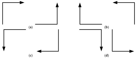 Different turns allowed of different RDs. (a) RD = 00; (b) RD = 10; (c) RD = 11; (d) RD = 01.