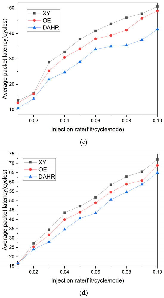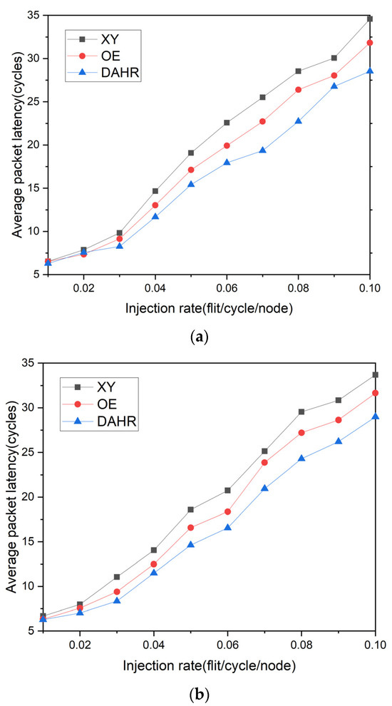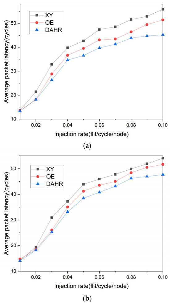 We utilized Noxim [34] to assess the performance of DAHR. Noxim is an open, configurable, scalable, and cycle-accurate NoC simulator developed in SystemC. Considering that the proposed DAHR uses both deterministic information and congestion information of adjacent nodes, we chose the most well-known deterministic XY routing and OE partially adaptive routing for comparison. Table 2 lists all of the simulation’s configuration parameters. Experimental simulations were conducted on 4 × 4 mesh and 8 × 8 2D mesh supported with wormhole switching. The length of the packet was set as 3~5 flits, and each flit’s width was set to 64 bits. The buffer of each input port had four VCs, each of which has five flit buffers.