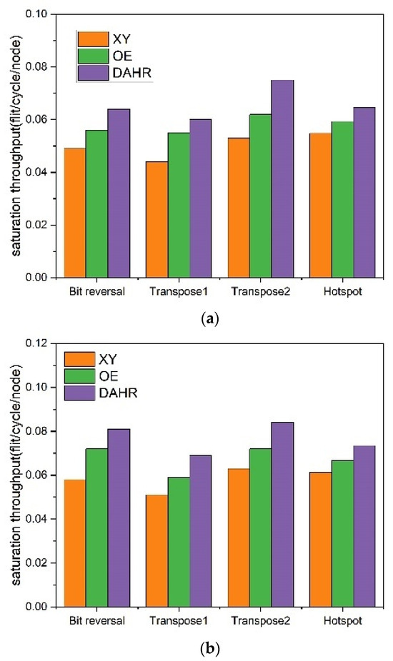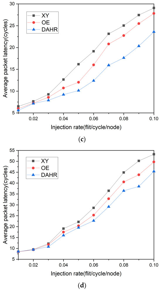 The saturation throughput of three routing strategies at two distinct network scales is shown in Figure 9. The findings show that the suggested DAHR’s simple algorithm and use of congestion information allow it to attain the maximum saturation throughput. Table 5 presents the saturation throughput of three routing schemes. In a 4 × 4 mesh, DAHR’s saturation throughput increases by at least 18.0% and 9.0% compared to XY and OE schemes, respectively. Additionally, DAHR also demonstrates better performance in larger networks. In a 8 × 8 mesh, DAHR’s saturation throughput increases by at least 19.7% and 10.2% compared to XY and OE schemes, respectively.