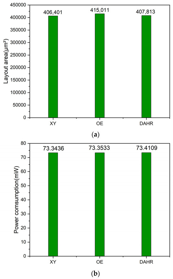 The RTL (register transfer level) codes of the XY, OE, and suggested DAHR routers were constructed using Verilog to assess the hardware overhead in terms of layout area and power consumption. The TSMC 130 nm process library was employed at 500 MHz and 1.08 V, utilizing the Design Compiler from Synopsys to assess the layout area and power consumption of the three router schemes. Figure 10 shows the hardware overhead of the routers. Because of its simplicity, the XY router was found to have the lowest hardware overhead. The DAHR algorithm does not add further complexity to the circuit, as seen by the layout area and power consumption being comparable to OE. According to the simulation results, DAHR obtained improved performance without overhead increasing.