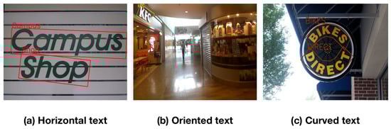 - Ch’ng, C.; Chan, C. Total-text: A comprehensive dataset for scene text detection and recognition. In Proceedings of the 2017 14th IAPR International Conference on Document Analysis and Recognition (ICDAR), Kyoto, Japan, 9–15 November 2017; Volume 1, pp. 935–942. [Google Scholar]