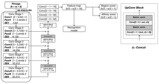 CRENet is an end-to-end trainable framework capable of spotting arbitrary-shaped text. As illustrated in Figure 3, CRENet directly detects characters on the feature maps of original images, eliminating the need for additional text region retrieval steps. Similar to other deep learning frameworks, the feature extraction module utilizes shared convolutions to extract image features, as shown in Figure 4. However, unlike most existing network architectures, we meticulously designed a fully convolutional architecture, structured as “SE-FPN-VGG16”, to effectively manage text feature complexity. We adopted VGG16 [53] as the backbone network, discarding its final pooling layer and fully connected layers. Inspired by the SE Network [54], we integrated Squeeze-and-Excitation (SE) blocks into each convolutional stage. The SE block focuses on channel relationships, adaptively recalibrating channel-wise feature responses by explicitly modeling interdependencies between channels. As illustrated in Figure 4, the SE block recalculates each channel’s weight using a fully connected layer and a Rectified Linear Unit (ReLU) function, enhancing the generalization performance of our framework. Additionally, while deeper CNN layers encode higher-level semantic information, shallower layers retain more precise localization details. To leverage this complementary information, we employed an FPN (Feature Pyramid Network) [55] to gradually merge convolutional features from the conv5, conv4, conv3, and conv2 layers, enabling multi-scale context representation. Subsequently, we applied four stacked convolutional layers, utilizing 3 × 3 and 1 × 1 filters, to squeeze channel dimensions from 32 to 16. Finally, the feature map, downsampled to half the input size, was fed into downstream tasks for character spotting.