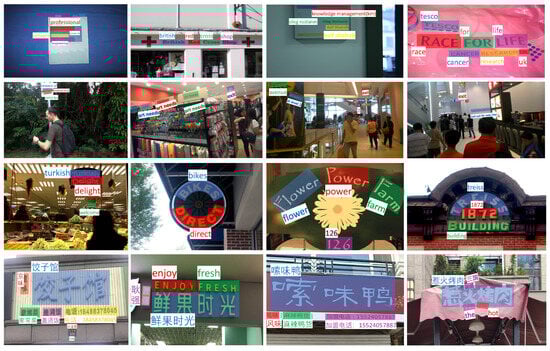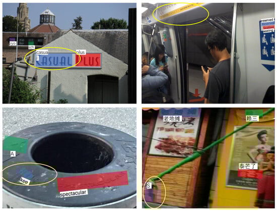 - Karatzas, D.; Gomez-Bigorda, L.; Nicolaou, A.; Ghosh, S.; Bagdanov, A.; Iwamura, M.; Matas, J.; Neumann, L.; Chandrasekhar, V.; Lu, S.; et al. ICDAR 2015 competition on robust reading. In Proceedings of the 2015 13th International Conference on Document Analysis and Recognition (ICDAR), Tunis, Tunisia, 23–26 August 2015; pp. 1156–1160. [Google Scholar]