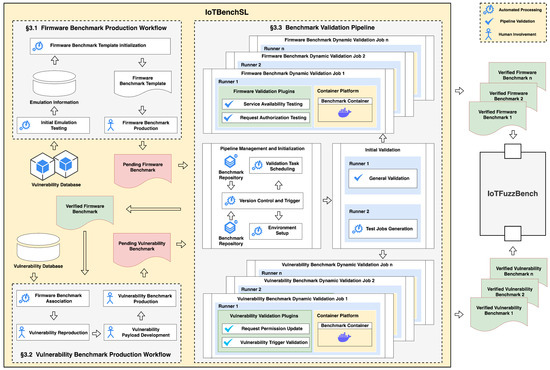 At a high level, the IoTBenchSL workflow proceeds as follows: First, we collect firmware from various sources to build an initial firmware dataset. Then, through the Firmware Benchmark Production Workflow, we generate a set of pending firmware benchmarks, which are automatically verified for completeness and usability via the Benchmark Validation Pipeline. Successfully verified firmware benchmarks are then used in the Vulnerability Benchmark Production Workflow to generate a set of pending vulnerability benchmarks, further validated through the Benchmark Validation Pipeline. Finally, the verified firmware and vulnerability benchmarks are used as inputs for our previously proposed fuzzing scheduling framework, IoTFuzzBench, enabling large-scale fuzzing evaluations.