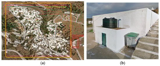 Village of Pirgos Tinos: (a) map of the village of Pirgos [37]; (b) the water tank of the experiment.