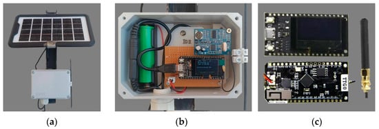 Water tank level monitoring station [34]: (a) the autonomous energy water tank level monitoring station; (b) the parts of the monitoring station; (c) microcontroller TTGO@ESP32.
