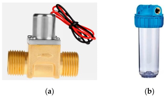 Two electromagnetic valves (Figure 4a) and a plastic container (Figure 4b) were used for the needs of the experiment in terms of water intake from the tank and for the measurement procedure. The two electromagnetic valves were attached to the plastic container, one for water filling and the other for water draining. The plastic container used was from a water filter and was tapered at the bottom for the complete absorption of the water sample. Given that the measurements were taken periodically, the procedure for the measurement was as follows. At the start of the procedure, both electromagnetic valves were opened for a short period of time to purge the container with water, then only the first electromagnetic valve was operated to fill the plastic container from the supply of the tank. The operating time of the first electromagnetic valve was calculated so that the container was filled with water and the sensors were in the water, then the measurements were taken and finally only the second electromagnetic valve was opened to drain out the water. It is important to note that any residual microplastics released from the container did not affect the conductivity of the water sample and, consequently, did not impact the measurements. The water filter’s (food grade) plastic container was placed in a concealed place, where it would be unaffected by any environmental conditions, especially high temperatures.