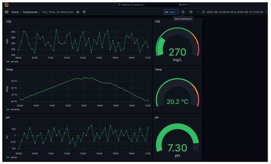 In this section, the measurements of the water quality through the web interface of the Grafana software as well as the methodologies used for the normalization of the measurements are presented. The water quality data are reported on total dissolved solids (TDS), water temperature, and pH. The evaluation of the results was carried out by comparing the measurements from the low-cost water quality monitoring system with the measurements from reference instruments (for TDS the reference instrument is the Milwaukee TDS Meter MW401 PRO (Milwaukee Electronics Kft, Szeged, Hungary), for temperature the Hanna Instruments HI 98509 (Hanna Instruments Inc, Woonsocket, RI, USA), and for pH the Milwaukee pH Meter MW101 PRO, (Milwaukee Electronics Kft, Hungary). As the monitoring instruments used do not support telemetry, the measurements were taken in the field (water tank). Finally, the evaluation of the results is presented through the root mean square error (RMSE), mean average deviation (MAD), and mean average error (MAE) methods.