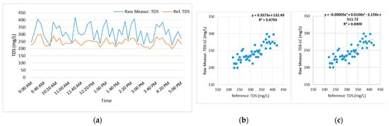 TDS measurements of the low-cost system and reference instrument: (a) time series of TDS measurements of the low-cost system and reference instrument; (b) scatter plot and the degree of determination (linear equation) between the measurements of TDS of the low-cost system and reference instrument; (c) scatter plot and the degree of determination (non-linear equation) between the measurements of TDS of the low-cost system and reference instrument.