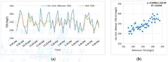 The results after applying Equation (1) to the TDS measurements from the low-cost system are shown in Figure 7. In particular, Figure 7a shows the time series of the corrected TDS measurements and the reference TDS measurements, while Figure 7b shows the scatter plot and the degree of correlation between the corrected TDS measurements and the reference TDS measurements.