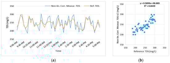 Non-linear corrected TDS measurements of the low-cost system and reference instruments: (a) time series of non-linear corrected TDS measurements of the low-cost system and reference instrument; (b) scatter plot and the degree of determination between the non-linear corrected TDS measurements of the low-cost system and reference TDS measurements.