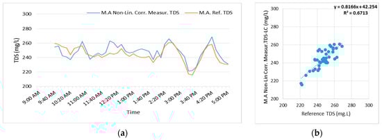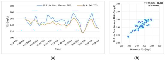 According to Figure 7 and Figure 8, which illustrate the corrected TDS measurements, although they show values close to the reference values, it is observed that there are residual deviations with respect to the reference measurements. For research purposes regarding the identification of trends indicated by the time series in terms of reliability and system evaluation, the moving average (MA) method (with an interval of 5) was applied to both the corrected (linear and non-linear) measurements of the low-cost system and the reference measurements to investigate the reliability of the results. Figure 9 shows the results of applying the moving average to the measurements of both the low-cost (linear corrected) and reference system. Figure 9a shows the time series of the measurements after applying the moving average method to the measurements of both the low-cost (linear corrected) and the reference system, while Figure 9b shows the scatter plot and the determination of the correlation coefficient after applying the moving average method to the measurements of both the low-cost (linear corrected) and the reference system.