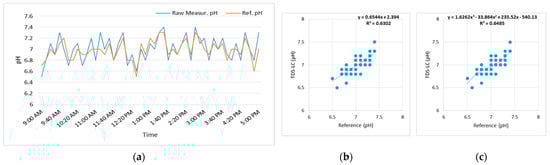 pH measurements of low-cost system and reference instrument: (a) Time series of water pH measurements of low-cost system and reference instrument; (b) Scatter plot and the degree of determination (linear equation) between the measurements of water pH of low-cost system and reference instrument; (c) Scatter plot and the degree of determination (non-linear equation) between the measurements of water pH of low-cost system and reference instrument.