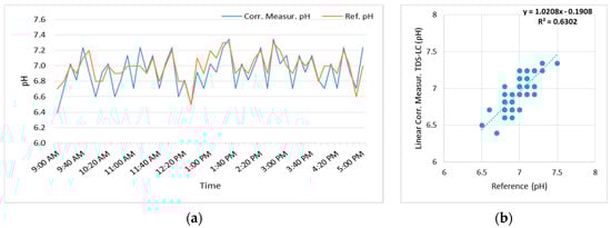 After applying Equation (3) to the raw pH measurements from the low-cost system, the results are shown in Figure 13. Specifically, Figure 13a shows the time series of the corrected pH measurements and the reference pH measurements, while Figure 13b shows the scatter plot and the degree of correlation between the corrected pH measurements and the reference pH measurements.