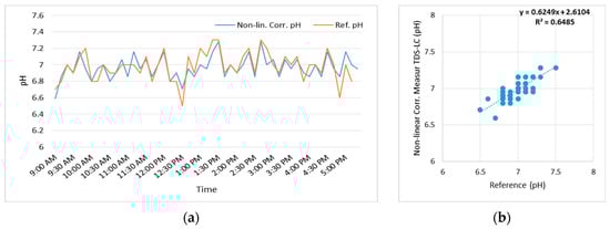 Figure 14a shows the time series of the corrected pH measurements and the reference TDS measurements by non-linear equation, while Figure 14b shows the scatter plot and the degree of correlation between the corrected pH measurements and the reference pH measurements by non-linear equation.