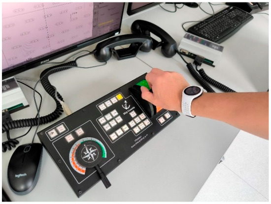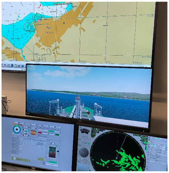 This research was conducted in Wartsila’s Navi Trainer 5000 ship handling simulator, which consists of a modern and ergonomic navigation console with standard navigation equipment, such as redundant multifunctional displays, a conning station, a radar display with an electronic chart, and an overhead monitor (Figure 2). The visualization offers multiple types of vessels for creating the most complex scenarios in different weather conditions and navigation areas, providing a 270° view of the scene [23]. The activities in the simulator were recorded with a standard web camera to avoid inconsistencies during post-processing [24].