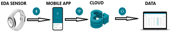Wireless setup: The EDA sensor connects to the mobile app software via Bluetooth, enabling real-time data transmission to a cloud platform via Wi-Fi. Data access is provided through a cloud portal, which offers options for visualization and further analysis.