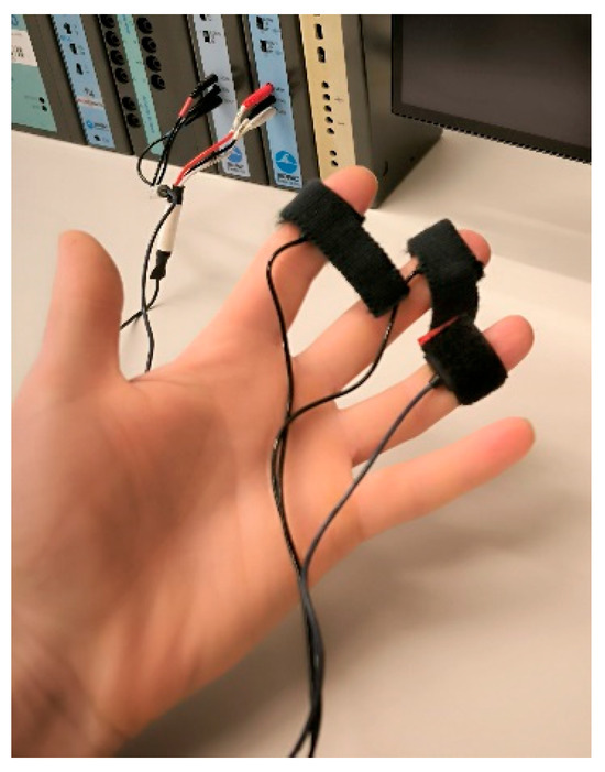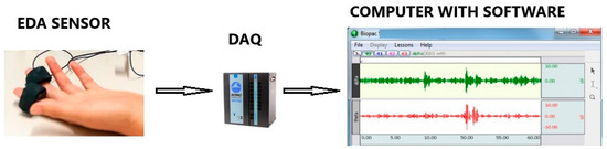 The control data were recorded using a Biopac MP 150 wired medical-grade physiological monitoring system [3], which is widely used in academic and clinical studies [26,27] and offers high-precision data acquisition with customizable sampling rates and multiple input options, enabling the recording of various physiological signals, including electrodermal activity (Figure 4). Its modular design requires a wired EDA sensor and an additional computer with specialized software for data acquisition and analysis; however, it provides greater control and accuracy for detailed physiological research.