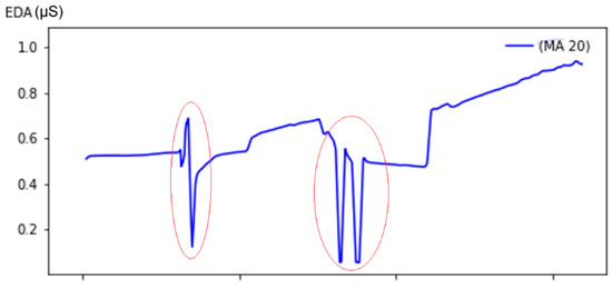 Apart from the obvious reason for the absolute value differences, which is the density of the sweat glands in the skin tissue where the electrodes were attached [34], the performance of the wireless sensor was affected by certain factors, notably the presence of body hair on participants’ hands, which interfered with electrode–skin contact. Figure 7b illustrates instances where the red trend (wireless sensor) shows signal degradation approaching noise levels due to poor electrical contact with hairy skin. Although this limitation affected signal amplitude, post-processing methods allowed us to mitigate some of the noise, enabling the wireless sensor to detect SCR patterns similar to those captured by the wired sensor, which highlights the importance of optimizing electrode contact for consistent data quality in real-world settings.